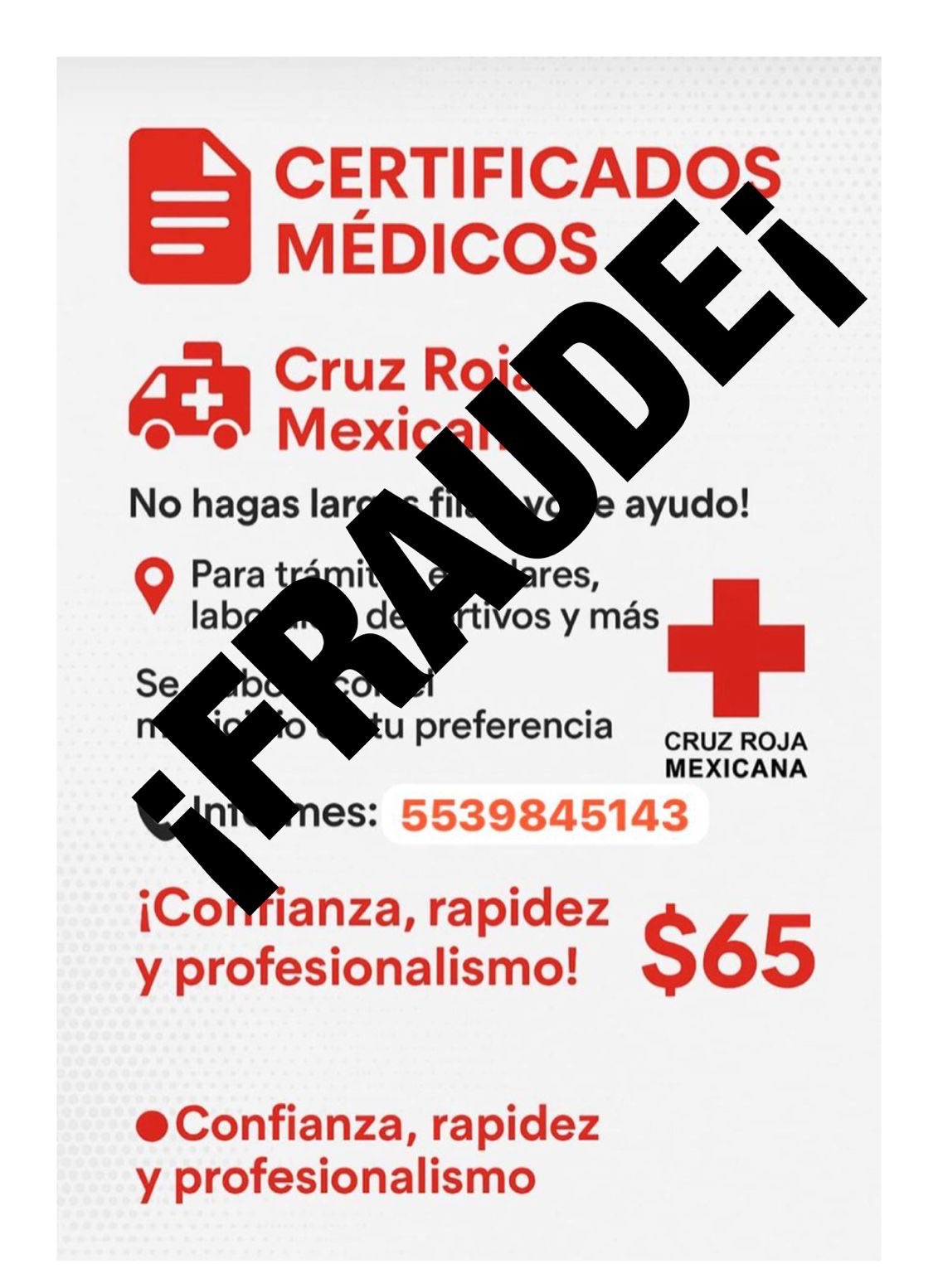 Cruz Roja Mexicana, Delegación Estado de México, alerta que en internet, a través de páginas apócrifas y cuentas en redes sociales, personas sin escrúpulos ofrecen supuestos “certificados médicos”, a cambio de una cantidad de dinero, haciendo transferencias bancarias y únicamente enviando los datos personales (nombre, edad, peso corporal, estatura) de la persona que a la que se expedirá el documento.