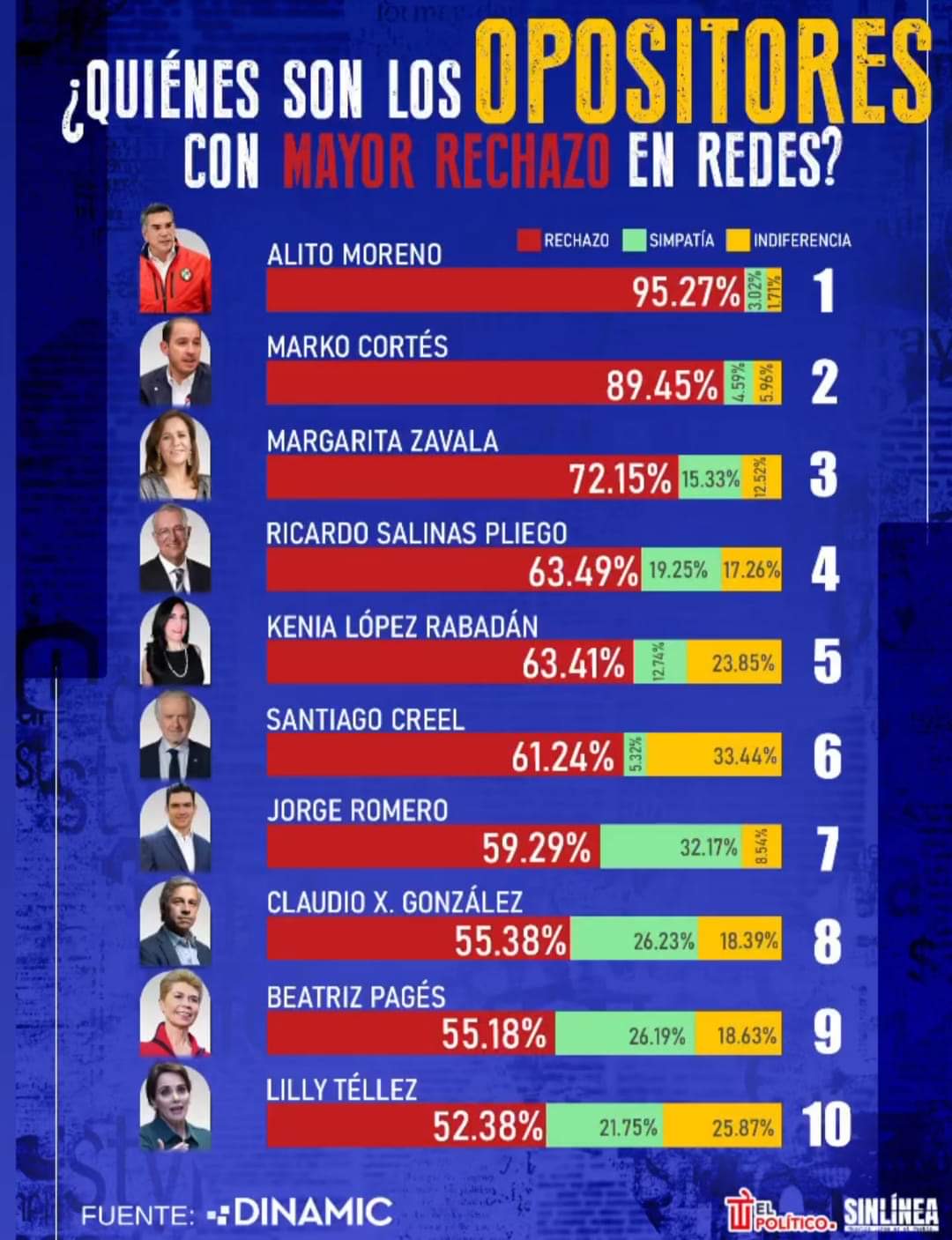 En 38 días Dinamic examinó una muestra de 519 mil 203 comentarios en Facebook, X (antes Twitter), Instagram, Youtube, TikTok y Linkedin y los resultados colocaron a “Alito” Moreno como el personaje menos aceptado, quien recibió un 95.27% de rechazo en conversaciones digitales. Obtuvo un 3.02% de simpatía y 1.7% de indiferencia.