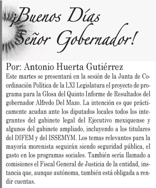 Este martes se presentará en la sesión de la Junta de Coordinación Política de la LXI Legislatura el proyecto de programa para la Glosa del Quinto Informe de Resultados del gobernador Alfredo Del Mazo.