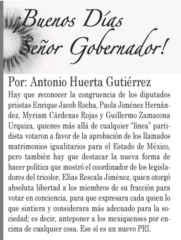 Hay que reconocer la congruencia de los diputados priistas Enrique Jacob Rocha, Paola Jiménez Hernández, Myriam Cárdenas Rojas y Guillermo Zamacona Urquiza, quienes más allá de cualquier “línea” partidista votaron a favor de la aprobación de los llamados matrimonios igualitarios para el Estado de México, pero también hay que destacar la nueva forma de hacer política que mostró el coordinador de los legisladores del tricolor, Elías Rescala Jiménez, quien otorgó absoluta libertad a los miembros de su fracción para votar en conciencia, para que expresara cada quien lo que sintiera y considerara más adecuado para la sociedad; es decir, anteponer a los mexiquenses por encima de cualquier cosa.