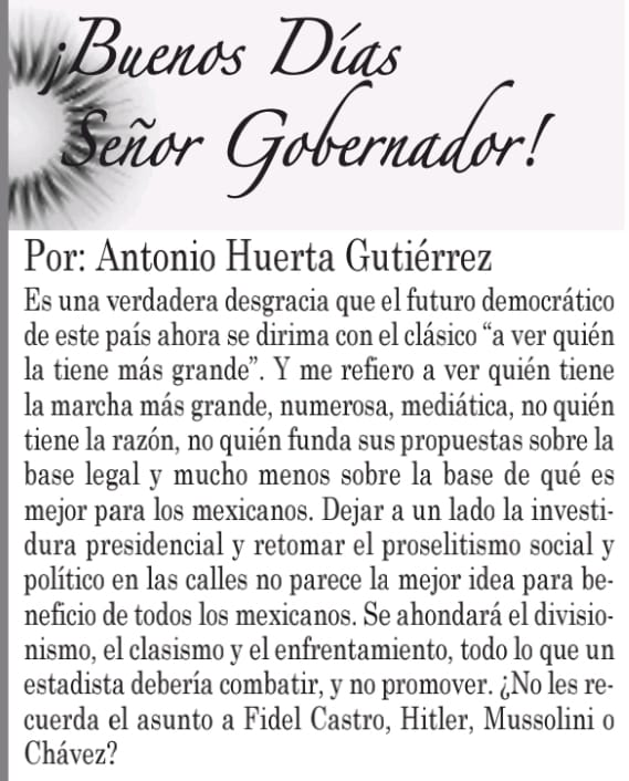 Y me refiero a ver quién tiene la marcha más grande, numerosa, mediática, no quién tiene la razón, no quién funda sus propuestas sobre la base legal y mucho menos sobre la base de qué es mejor para los mexicanos.