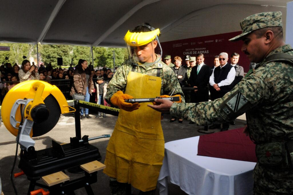 Toluca, Estado de México.- La Gobernadora Delfina Gómez Álvarez dio inicio al programa de Canje de Armas 2024, mediante el cual la población puede entregar un arma de fuego de manera voluntaria, anónima y pacífica a cambio de una remuneración económica, acción que forma parte de las Ferias de la Paz y su objetivo es inhibir el uso de estos artefactos en actos de violencia.