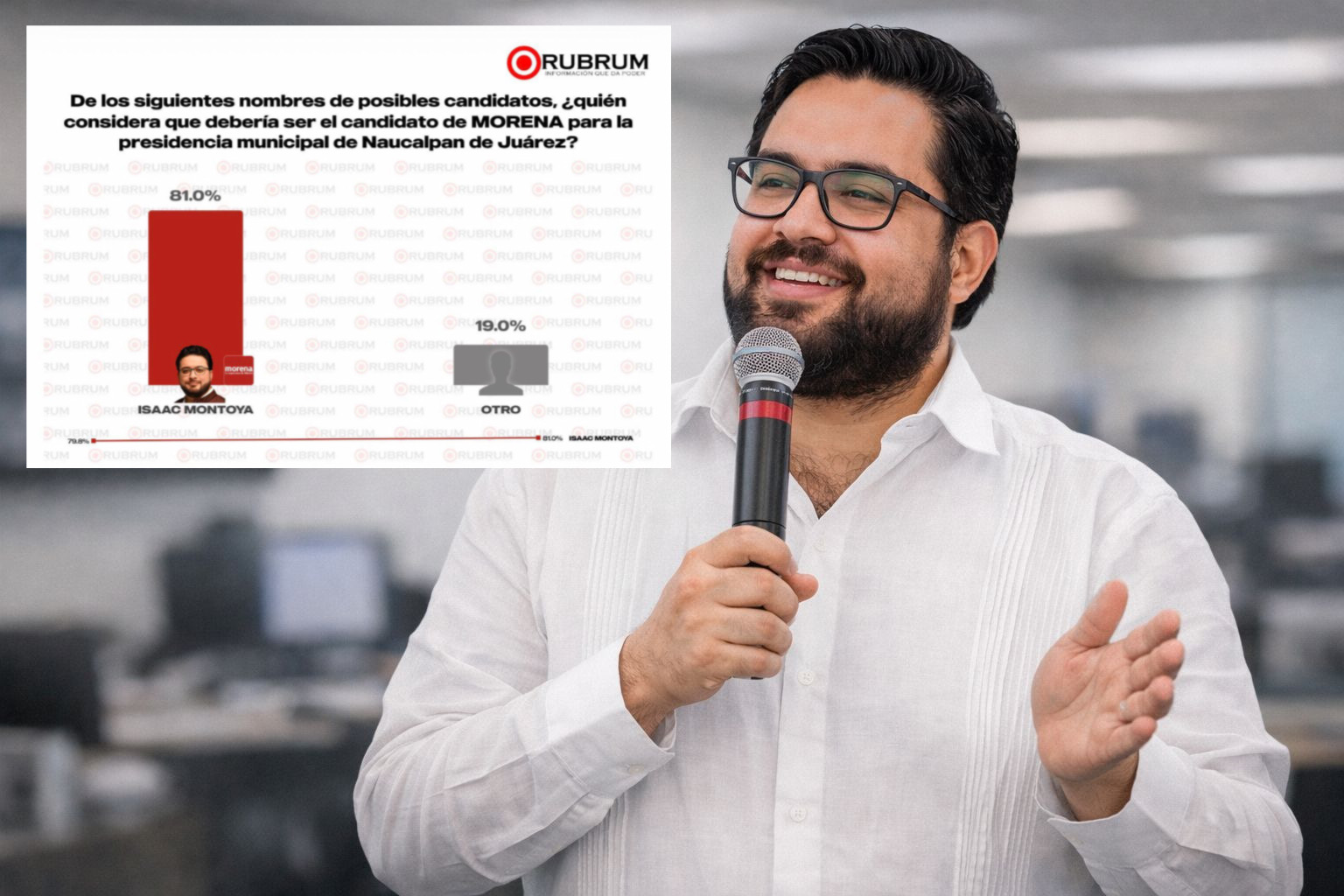 El liderazgo del alcalde de Naucalpan, Isaac Montoya, comienza a reflejarse en las encuestas rumbo a la elección municipal de 2027, de acuerdo con los datos más recientes de la consultora RUBRUM, que lo ubican con una preferencia de 81 por ciento frente a 19 por ciento de otras opciones.